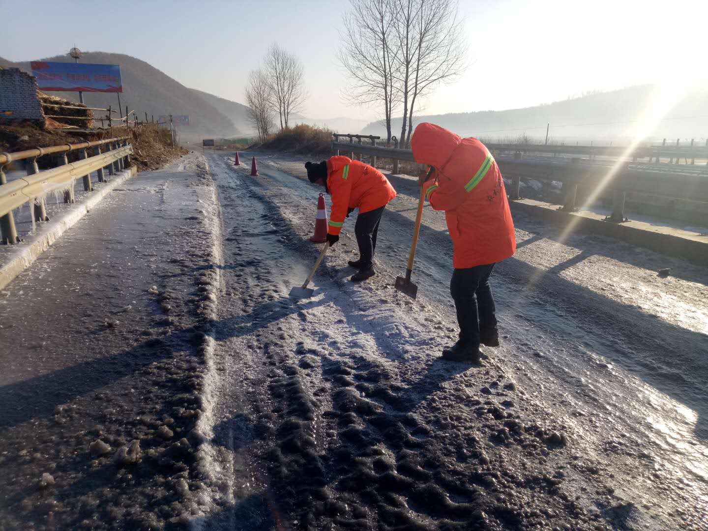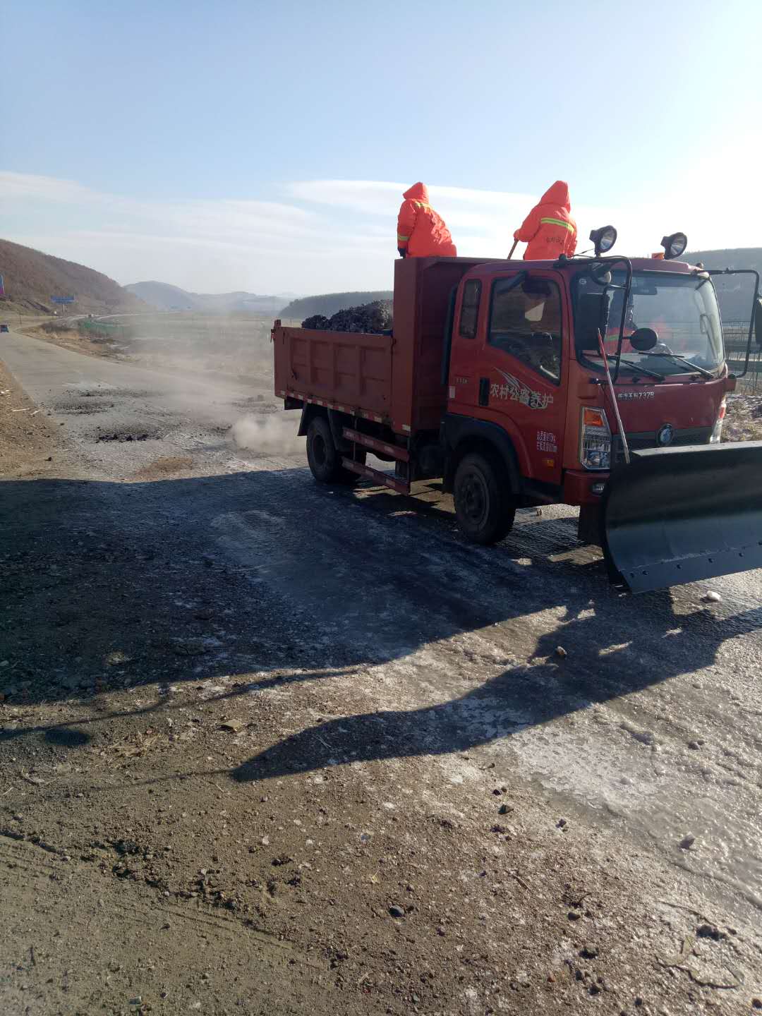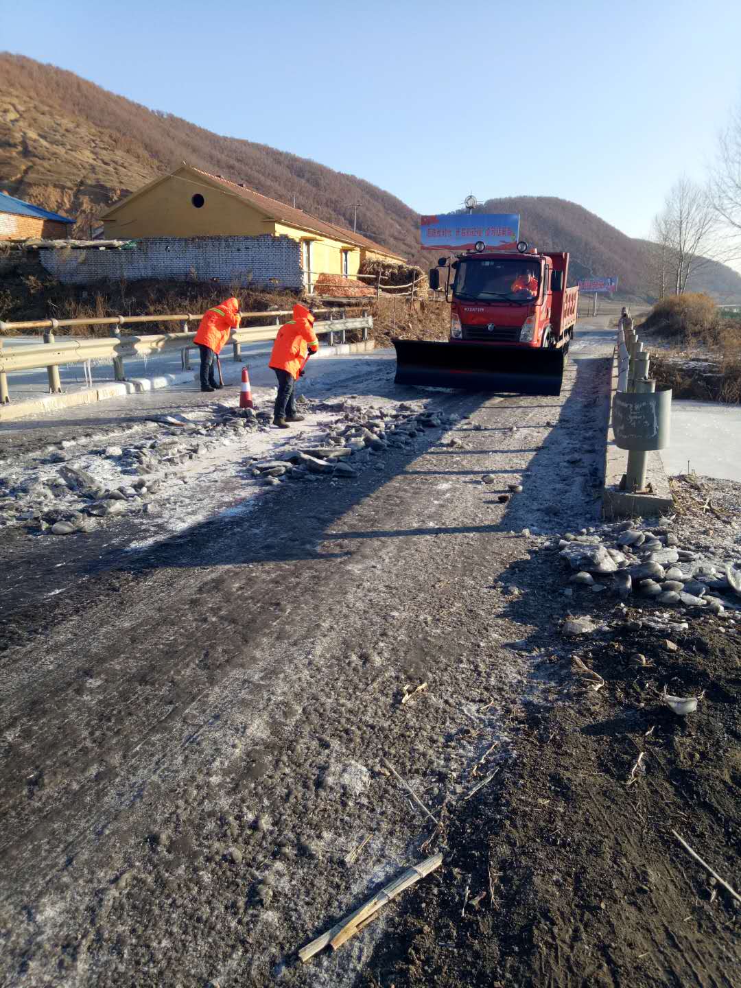 工作人员在处置冰湖的同时又安排人员查找冰湖形成的原因,并用60袋炉灰将山泉水流淌方向做了调整,彻底解决了山泉水再次上路的情况,为确保该路段清冰后路面更加安全畅通,工作人员又在路面上铺撒防滑料,为百姓出行提供了安全保障。