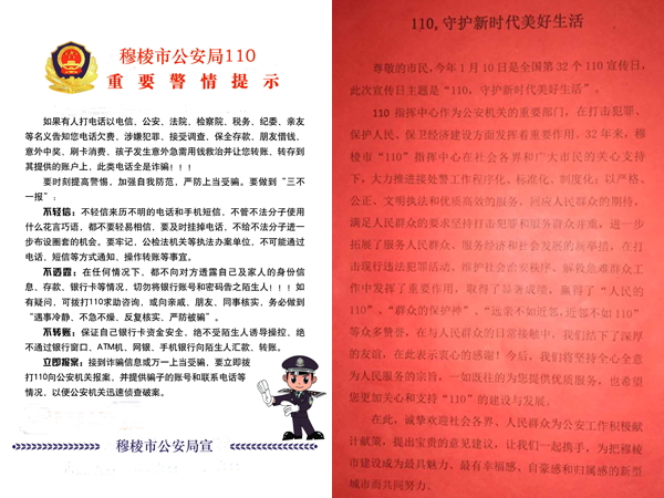 为全面宣传公安110在打击违法犯罪、救助、服务群众、维护社会稳定方面取得的社会成果,按照牡市局工作要求,穆棱市公安局以“110,守护新时代美好生活”为主题,以警营开放日、新闻媒体系列报导、现场宣传活动为载体,开展了一系列的“110宣传月”活动,赢得了社会各界和广大人民群众一致好评。1月10日上午,市局组织相关单位同步开展“110宣传日”活动,掀起了全市110宣传高潮,进一步展示了公安机关良好形象。